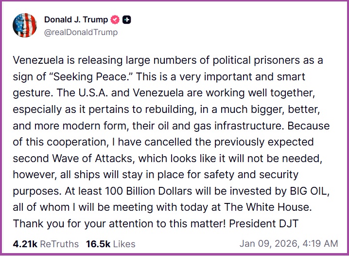 Following the U.S. capture of Nicolás Maduro, Venezuela’s new government under Delcy Rodríguez has begun releasing political prisoners in a bid to foster unity and peace. The change in Venezuelan politics comes directly as the result of President Trump using the military to block oil shipments, the major source of revenue for the nation.