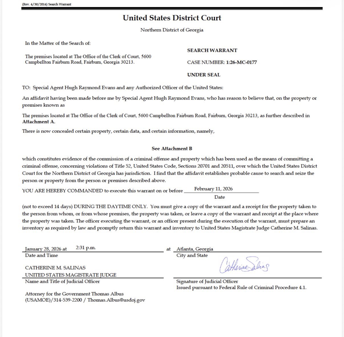 Wednesday’s operation also follows a December 2025 admission by Fulton County elections officials that they did not properly sign tabulator tapes after the 2020 election, which is a violation of state regulations.