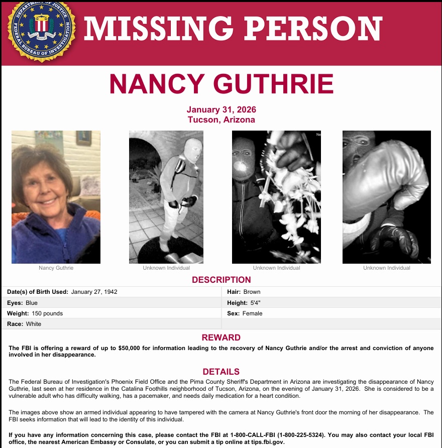 “The FBI is offering a reward of up to $50,000 for information leading to the recovery of Nancy Guthrie and/or the arrest and conviction of anyone involved in her disappearance. New images released today show an armed individual appearing to have tampered with the camera at Nancy Guthrie’s front door the morning of her disappearance. The FBI seeks information that will lead to the identity of this individual” [FBI RELEASE]