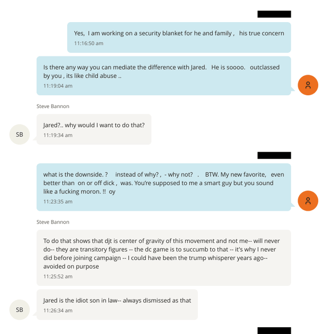 Unfortunately, part of the document production includes text messages between Steve Bannon and an unknown individual. Within a segment of the text messages Bannon calls Jared Kusher “the idiot son-in-law,” and frames himself as more important that President Donald Trump who Bannon sees as “transitory.”