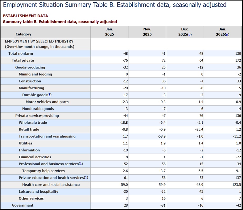 The Bureau of Labor and Statistics releases the employment figures for January today [BLS DATA HERE]. Overall, in the establishment survey, 130,000 jobs were added and the unemployment rate fell to 4.3%. This is much stronger than anticipated and there are indications of significant movement back to work as the exfiltration of illegal alien workers continues.