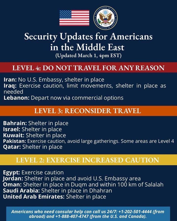 “Following the launch of U.S. combat operations in Iran, Americans worldwide and especially in the Middle East should follow the guidance in the latest security alerts issued by the nearest U.S. embassy or consulate. They may experience travel disruptions due to periodic airspace closures. The Department of State advises Americans worldwide to exercise increased caution.”