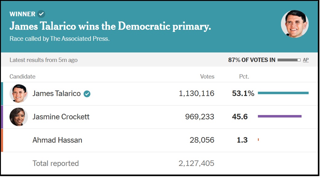 In other good news the insufferable Jasmine Crockett has lost her Democrat senate race. [SOURCE]