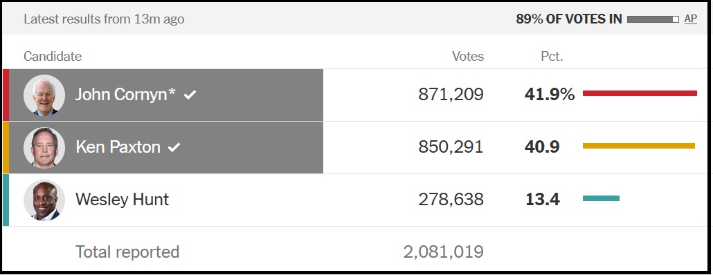In the statewide republican senate primary, incumbent Senator John Cornyn and Texas Attorney General Ken Paxton will advance to a runoff. Cornyn received 42%, Paxton received 41%, Wesley Hunt received 13.5%. Because no candidate won more than 50% of the vote, Paxton and Cornyn will now advance to a runoff on May 26th. [SOURCE]