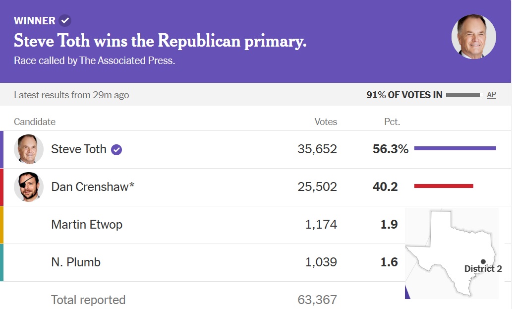 Texas DeceptiCON Dan Crenshaw, aka “one-eyed McCain”, a man of notoriously arrogant and intemperate disposition, has lost the Texas CD02 primary race to Steve Toth. Mr Toth won 56% of the primary vote, so there will not be a runoff.