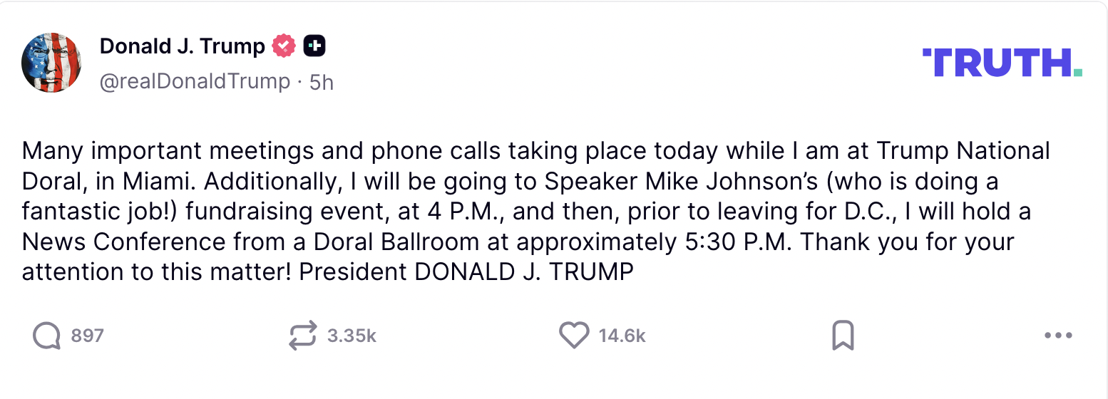 The President is holding the news conference at Trump National Doral golf resort in Miami.  He’ll be traveling back to the White House later this evening.