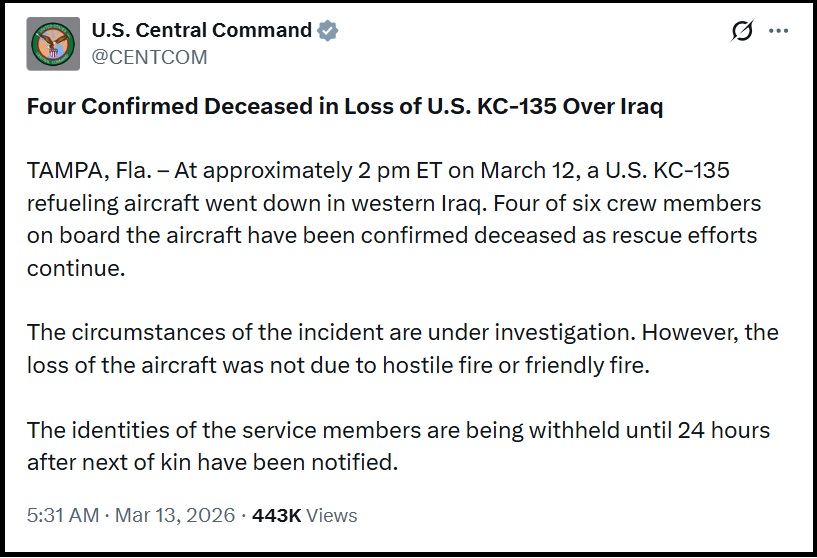 CENTCOM has confirmed the loss of a KC-135 refueling aircraft, Stratotanker, that went down in western Iraq.