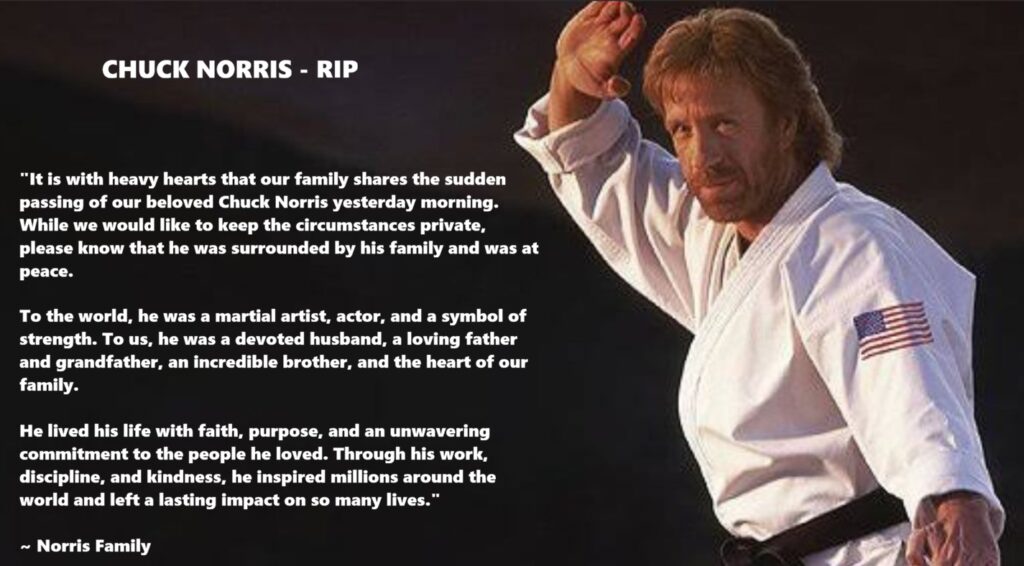 Sad news. The family of Chuck Norris has confirmed his death, Thursday, March 19, with a post to Instagram on Friday, March 20.