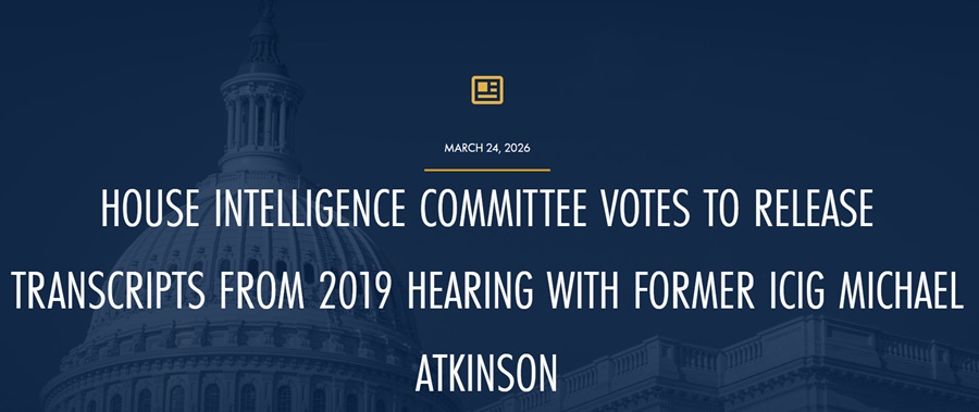 WASHINGTON, D.C.— Today, the House Permanent Select Committee on Intelligence held a business meeting to consider multiple Committee actions. During the business meeting, the Committee voted in favor of releasing two transcripts from 2019 hearings with the former Intelligence Community Inspector General, Michael Atkinson. The hearings were held to examine Atkinson’s role in an alleged whistleblower complaint, which ultimately led to Democrats’ first impeachment efforts against President Trump in December 2019. One transcript would be released to the ODNI for classification review, and then subsequently released to the public by the Committee with the second unclassified transcript.