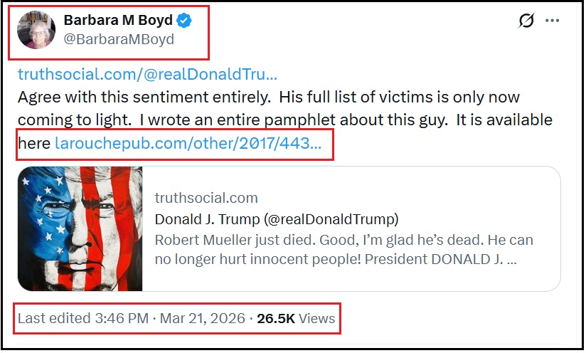 Lastly, each time a LaRouche PAC video is shared, the promoters of Promethean Action PAC try to obfuscate the relationship. It is a fact that Susan Kokinda and Barbara Boyd are life-long LaRouche followers and organizers. A recent tweet shared below will hopefully put this pretending (willful blindness) to rest.