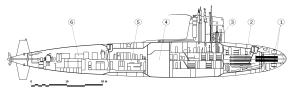 Skipjack-class submarine drawing: 1. Sonar arrays 2. Torpedo room 3. Operations compartment 4. Reactor compartment 5. Auxiliary machinery space 6. Engine room