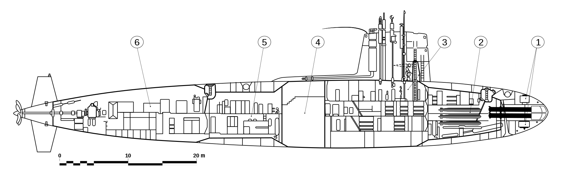 Skipjack-class submarine drawing: 1. Sonar arrays 2. Torpedo room 3. Operations compartment 4. Reactor compartment 5. Auxiliary machinery space 6. Engine room