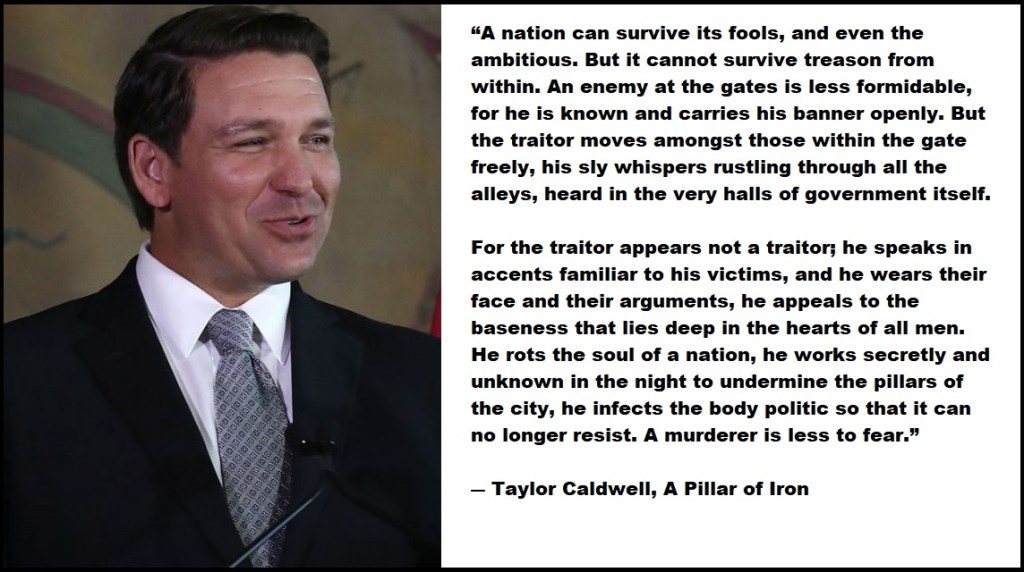 Accept things as they are, not as you would wish them to be.  Because this is the same man that many people would select to face the greatest enemy to our republic.  DeSantis is showing us right now that he does not possess the courage, desire in scale, or ability to fight the enemy we face in this battle.