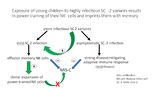 More infectious SC-2 variants may enable stronger stimulation of NK cells and thereby readily prime NK cell effector responses in young children; alternatively, more infectious SC-2 variants could increase the likelihood for viral re-exposure to occur in the presence of a relatively higher titer of infection-enhancing anti-S Abs. Both phenomena are likely to reduce the risk of MIS-C in young children.