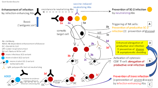 In vaccinees with poor experience in fighting productive infection (and hence, poor training of their innate immune defense according to pathway 1a-1b-1c) prior to C-19 vaccination, infection-enhancing Abs[6] that are responsible for preventing severe disease by binding to DC-tethered virus (according to 3a-3b-3c-3d pathway) can synergize with strongly activated cytotoxic CD8+ Tc-mediated killing (3c’) to even prevent C-19 disease all together and hence, render vaccinees asymptomatic despite their high susceptibility to re-infection (B + C ? D). As prevention of disease is not due to prevention of productive infection but to accelerated abrogation of infection, these vaccinees will continue to shed and transmit SC-2 upon re-infection. Whereas innate immune effector cells are MHC-unrestricted and polyspecific (i.e., NK cells) and, therefore, don’t drive immune escape, the infection-enhancing-Abs are Ag-specific (i.e., S-specific) and – if produced at high enough titers and with high enough affinity by a large part of the population – will promote natural selection of immune escape variants that can resist the virulence-inhibiting capacity of these Abs. This is because vaccinees cannot prevent productive viral infection; consequently, the immune pressure they exert on viral virulence is suboptimal in that it cannot prevent the expansion in prevalence of immune escape SC-2 variants that have the capacity to overcome this immune pressure. Resistance of viral variants to the virulence-inhibiting activity of infection-enhancing Abs will inevitably cause Ab-dependent enhancement of severe disease (ADESD).