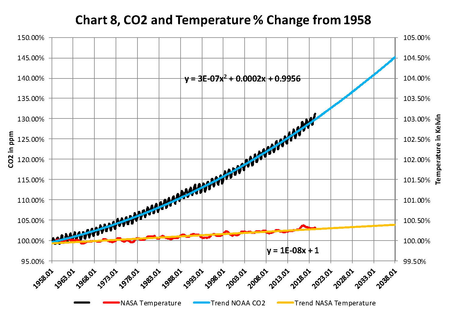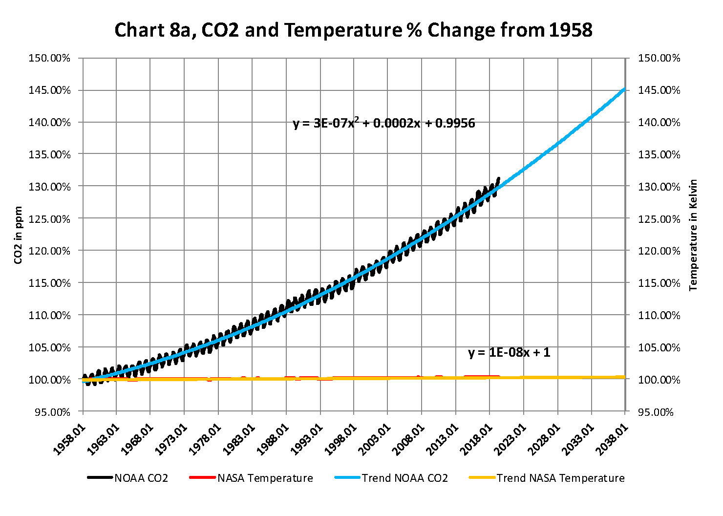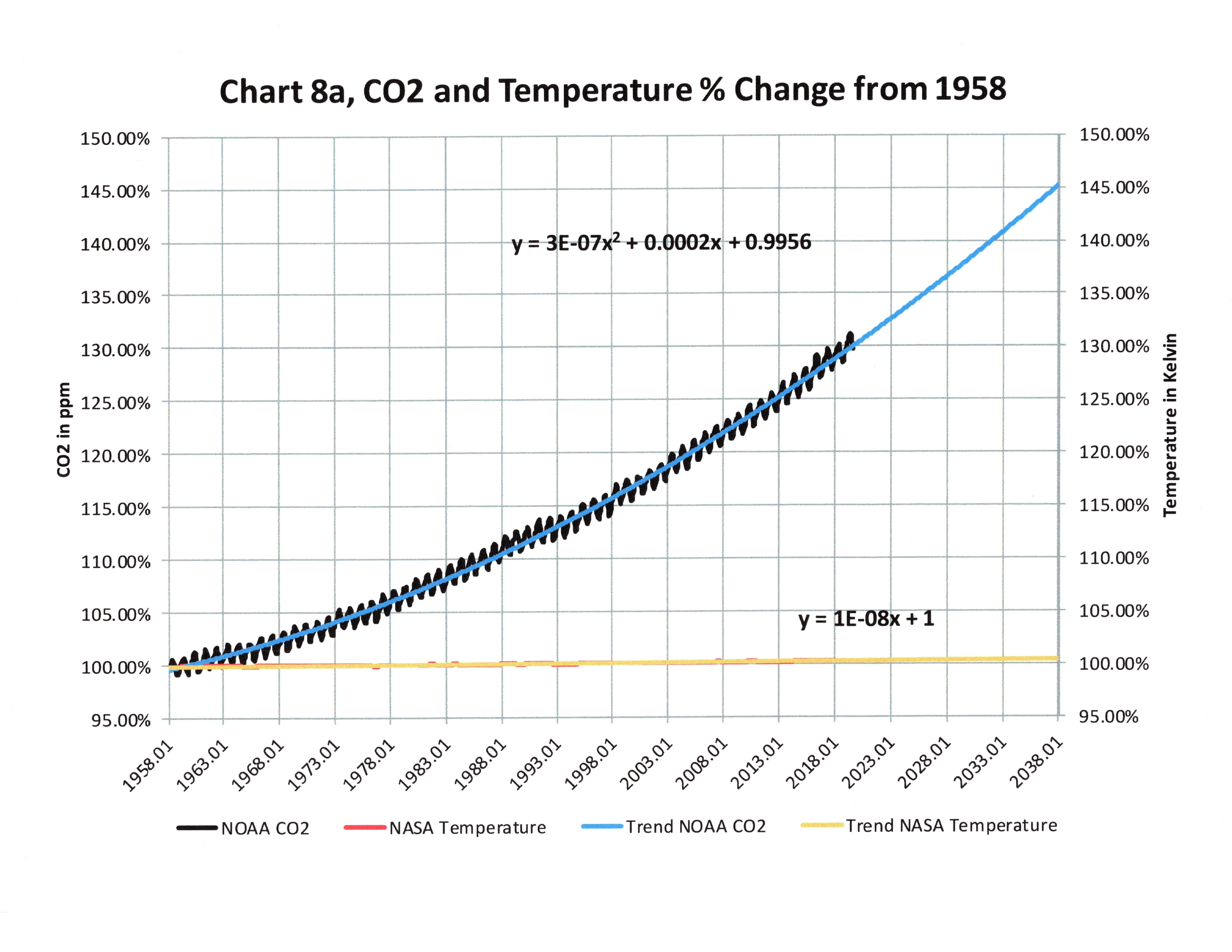 The next chart is Chart 8a which is the same as Chart 8 except for the scales which are the same for both CO2 and Temperature. As you see the increase in energy, heat, is not visually observably in this chart hence the need for the previous chart 8 to show the minuscule increase in thermal energy shown by NASA in relationship to the change in CO2. Based to these trends, determined by excel not me, in 2028 CO2 will be 428 ppm and temperatures will be 15.0o Celsius and in 2038 CO2 will be 458 ppm and temperatures will be 15.6O Celsius. This is what the data shows no matter what the reasons are, so I have no idea how the IPCC gets to predict that the world will end in ten or even twenty years.