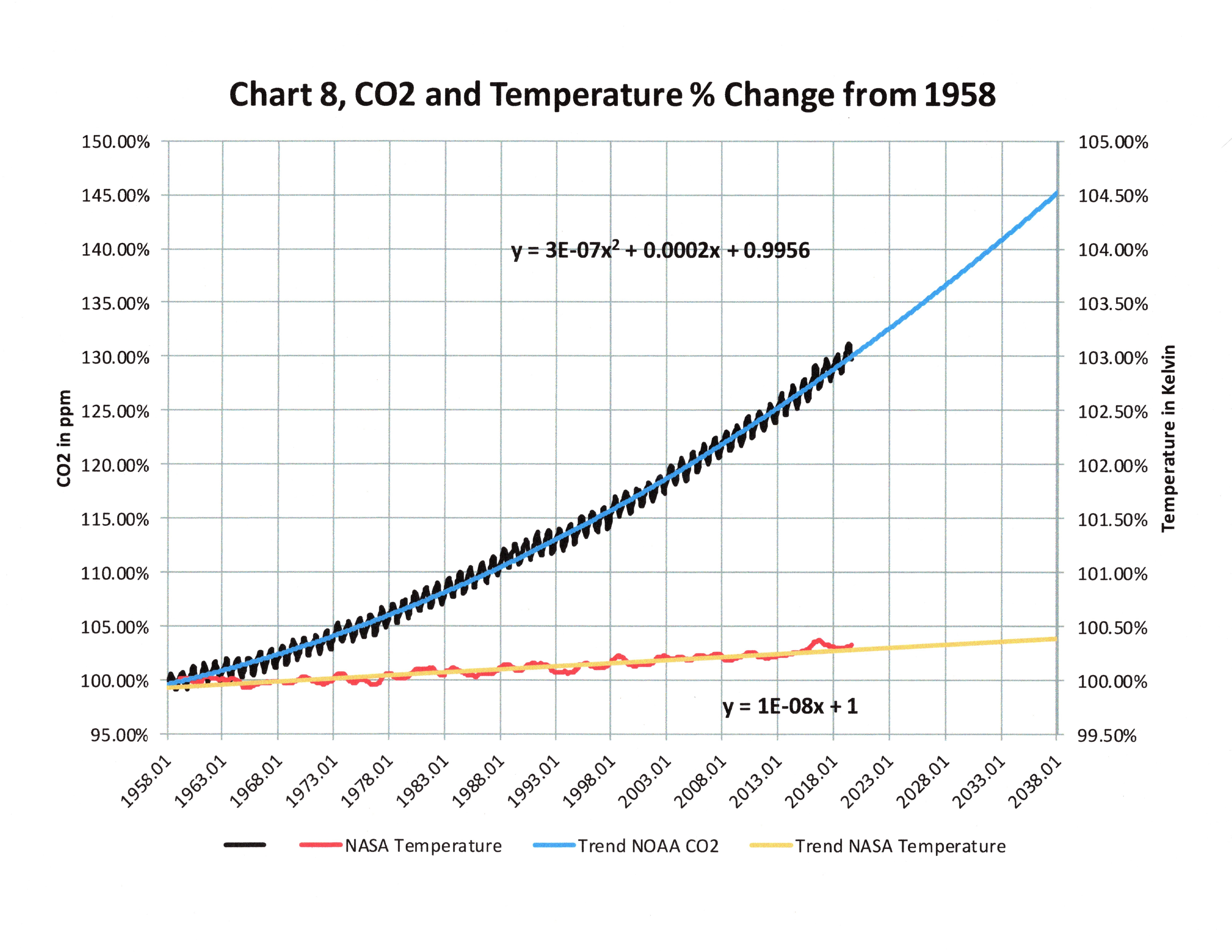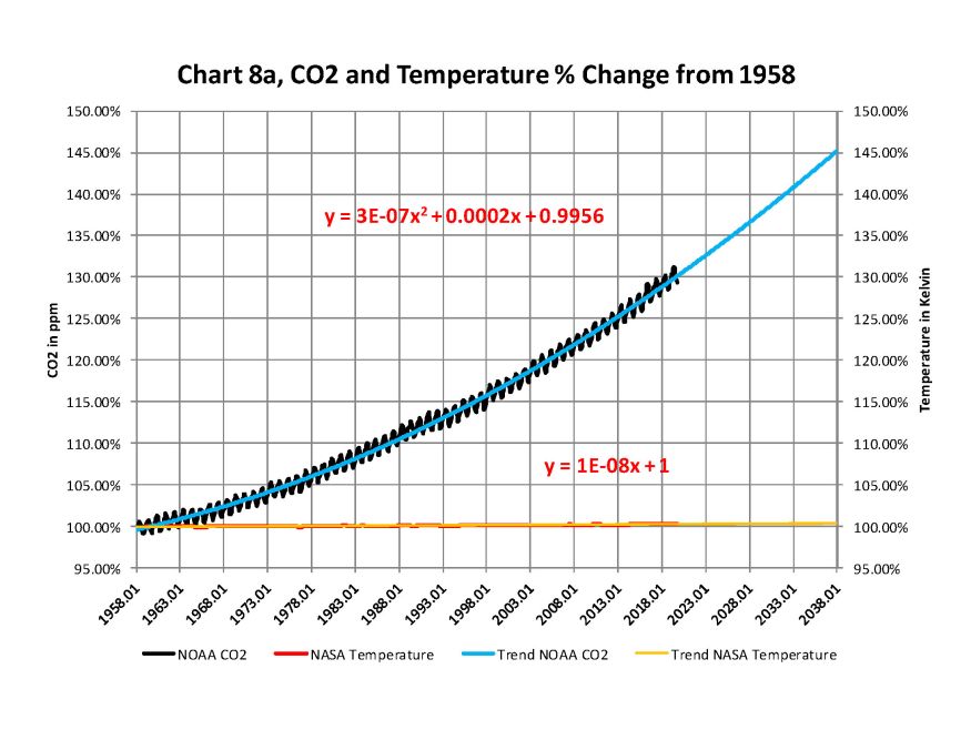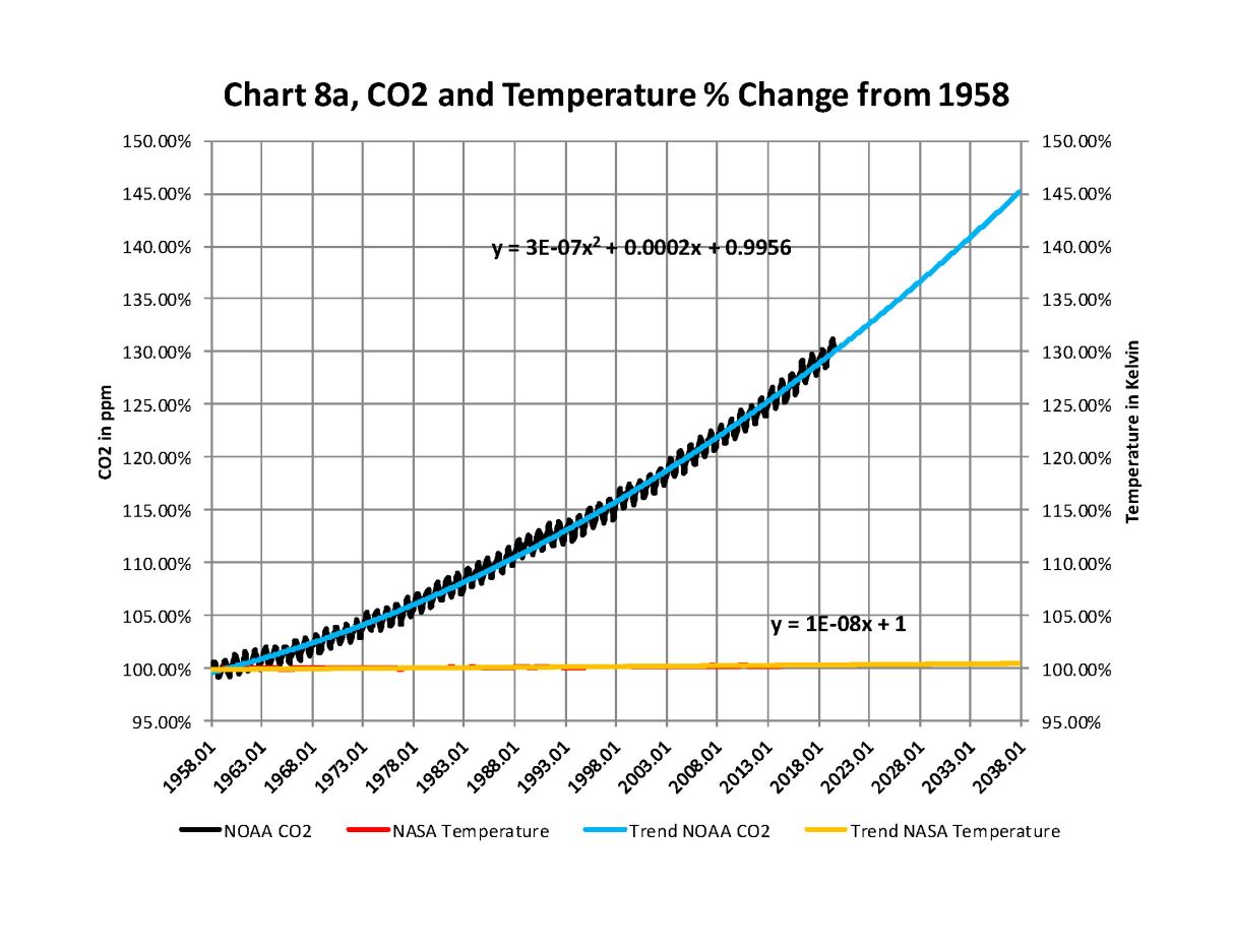 The next chart is Chart 8a which is the same as Chart 8 except for the scales which are the same for both CO2 and Temperature. As you see the increase in energy, heat, is not visually observably in this chart hence the need for the previous chart 8 to show the minuscule increase in thermal energy shown by NASA in relationship to the change in CO2. Based to these trends, determined by excel not me, in 2028 CO2 will be 428 ppm and temperatures will be 15.0o Celsius and in 2038 CO2 will be 458 ppm and temperatures will be 15.6O Celsius. This is what the data shows no matter what the reasons are, so I have no idea how the IPCC gets to predict that the world will end in ten or even twenty years.