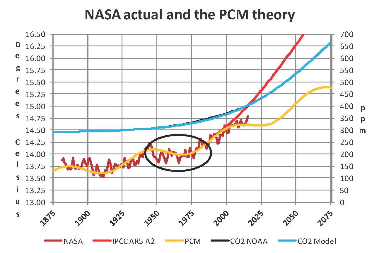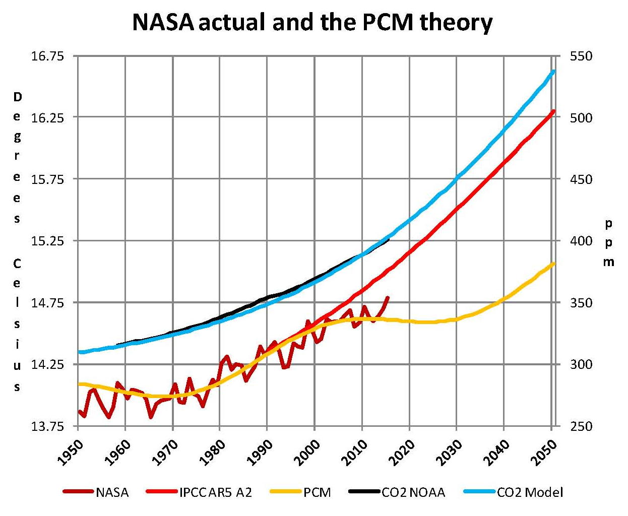 One other technical criticism of NASA is they use the period of 1950 to 1980 (30 years) to make their base for calculating anomalies, for some unknown reason. They determined that the mean temperature for that period was 14.0OC and they measure deviations from that in hundredths of a degree such that 15.04OC ends up as an anomaly of 104. This makes for interesting gyrations since they are always changing the values in their LOTI table and when they do so those values that end up in 1950 to 1980 period have to equal 14.0OC to make their system work, black oval in chart. It would have been much better to pick a value that had meaning such as 17.0OC which is the historic mean temperature of the planet. If they had done this then I would bet that the values around 1950 would be somewhat higher and closer to the yellow PCM plot. The next chart shows a closer view of the current period. In this Chart you can see the close relationship of CO2 and the IPCC AR5 A2 plot, this close of correlation leaves no room for other factors and since the IPCC has ruled out any natural reasons for climate change this makes sense. However if that assumption is wrong than the climate models are also wrong and that is why NASA manipulated the temperature values prior to COP21. The PCM model indicates that there will be no more warming until into the 2030’s