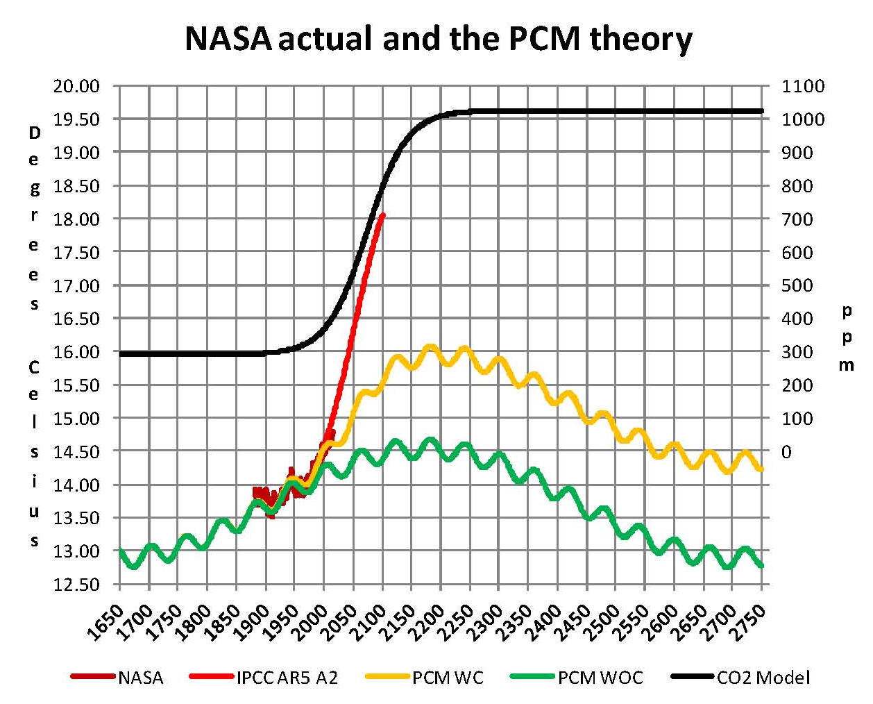 Global temperatures are published each month by NASA-GISS (NASA) in their Land Ocean Temperature Index (LOTI) which goes back to January 1880 and runs by month to the current date and is where we get temperatures to work with. In that data, one can observe both the ~1000 year cycle and also a shorter ~70 year cycle which were used to create a climate model based on those two cycles back in ‘07. However once that model, which I called the PCM (Pattern Climate Model), was completed it was found that there was another factor to consider which was the effect of increased levels of CO2. The addition of CO2 with a lower sensitivity values than that used by the IPCC, 0.65OC verses 3.0OC, gave excellent predictive values and was used very successful until 2014 since this model predicted the current “pause” and further showed it will last until the mid 2030s.