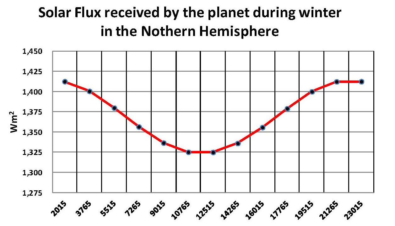This climate model has been rightly criticized as curve fitting and I cannot claim it is not; however it does work so it must be based on real processes at play on the planet. My best guess is there are two things going on the main one is the apsidal precession of the earth’s orbit which reverses the aphelion and perihelion to the seasons every ~10,000 years. Since the bulk of the land is in the northern hemisphere and the southern is mostly water this makes a big difference since the summers will get hotter and the winters will get colder in the northern hemisphere when the earth’s axis is pointing toward the sun at perihelion which it will be in 10,000 years. A plot of the changes in solar flux is shown on the next page. know this is not 1,000 years but I just have a feeling that it is related. The thermohaline ocean circulation is a 1,000 cycle and probably related to the precession but this alone cannot explain the global temperatures and so it has been dismissed.
