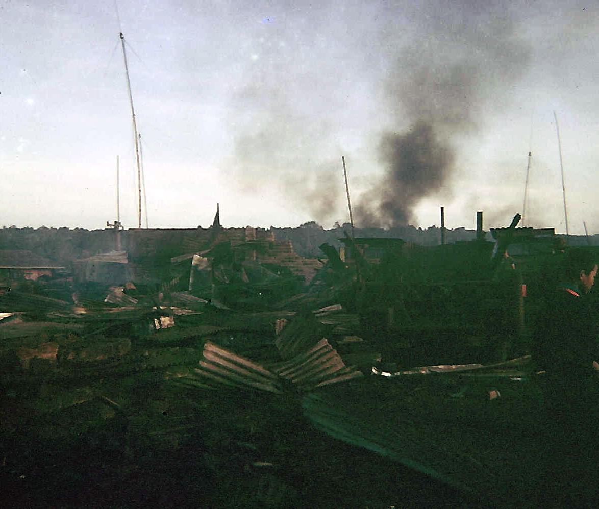 However, early in the morning at about 0300 hours one of these incoming rounds landed either: near the 4.2″ pit sending hot shrapnel into the ammo bunker; or it landed directly on the ammo bunker itself penetrating it with flash or hot shrapnel. In either case it didn’t matter for it ignited the propellant charges on the staged illumination rounds which are what propels the round to the target. Maybe even some of the illumination rounds themselves that we were getting ready to fire were set off. I do remember that there was a dull explosion and then several very intense waves of heat that went through the position igniting everything that could burn. Fortunately we had used up all the HE rounds that night and only a few illumination rounds were left unfired. If there had been any HE rounds in the pit and they had gone off when the incoming round hit they wouldn’t have found much if any of us. Just a few pieces and parts here and there scattered around the camp. For sure I wouldn’t be here talking to you.