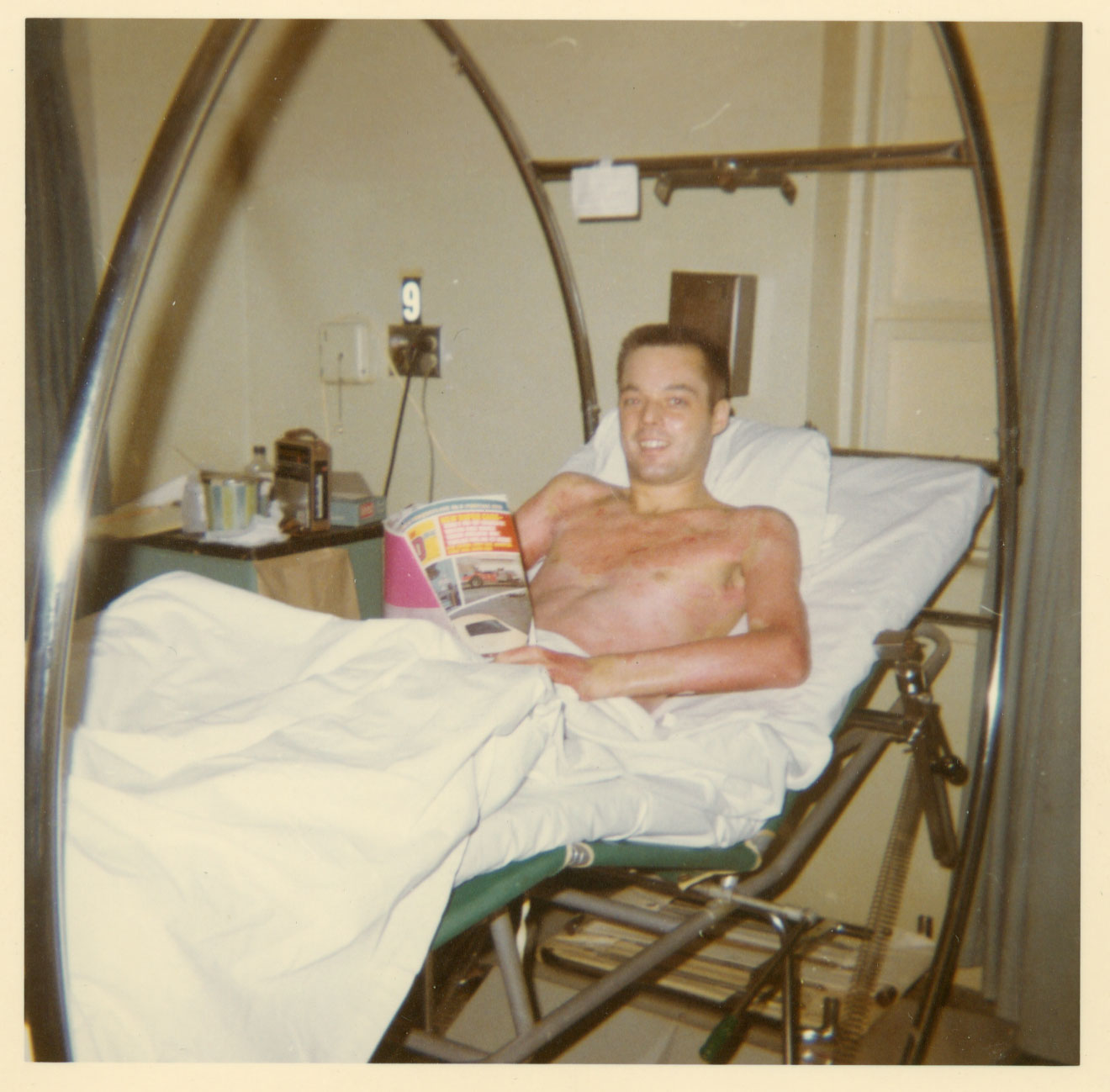 During the initial period of my treatment at Brooke I dropped from over 180 pounds to under 100 pounds (98 pounds if I remember correctly). As I started my recover I started to gain weight back and also to have fewer and fewer hallucinatory states. After getting skin grafts from by chest to my legs where the skin had been completely burned off and healing from those operations began I had to learn to walk again. That was a task, as the grafted areas would quickly swell up when standing as well as being very uncomfortable. It was probably five or six years later before I really felt comfortable walking and I was never able to run again for any length of time.