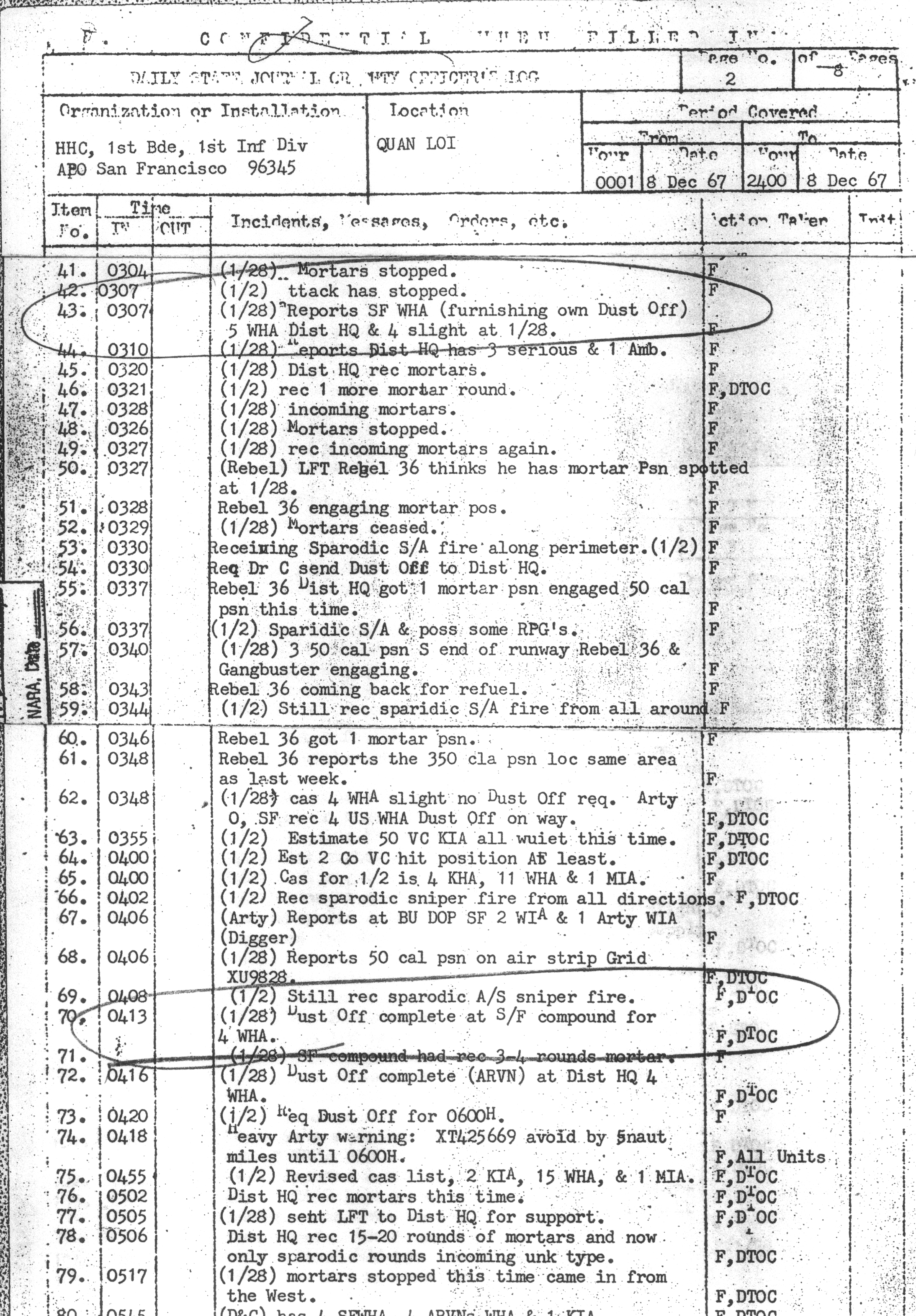 When doing the research for this book one of the documents I was able to get from the National Archives was the 1st Division radio logbook for the period November 25, 1967 through December 8, 1967.  When going through it to check the accuracy (dates and times) of what I was writing I found on two of the pages the references to my MEDEVAC.  It wasn’t my name  (names were not used in most cases) but it was the right date, time and place and I know it was me.  It was a very eerie feeling reading about your own MEDEVAC and also knowing that later you would almost die from those wounds.  It was almost like reading your own obituary, a very strange feeling indeed.