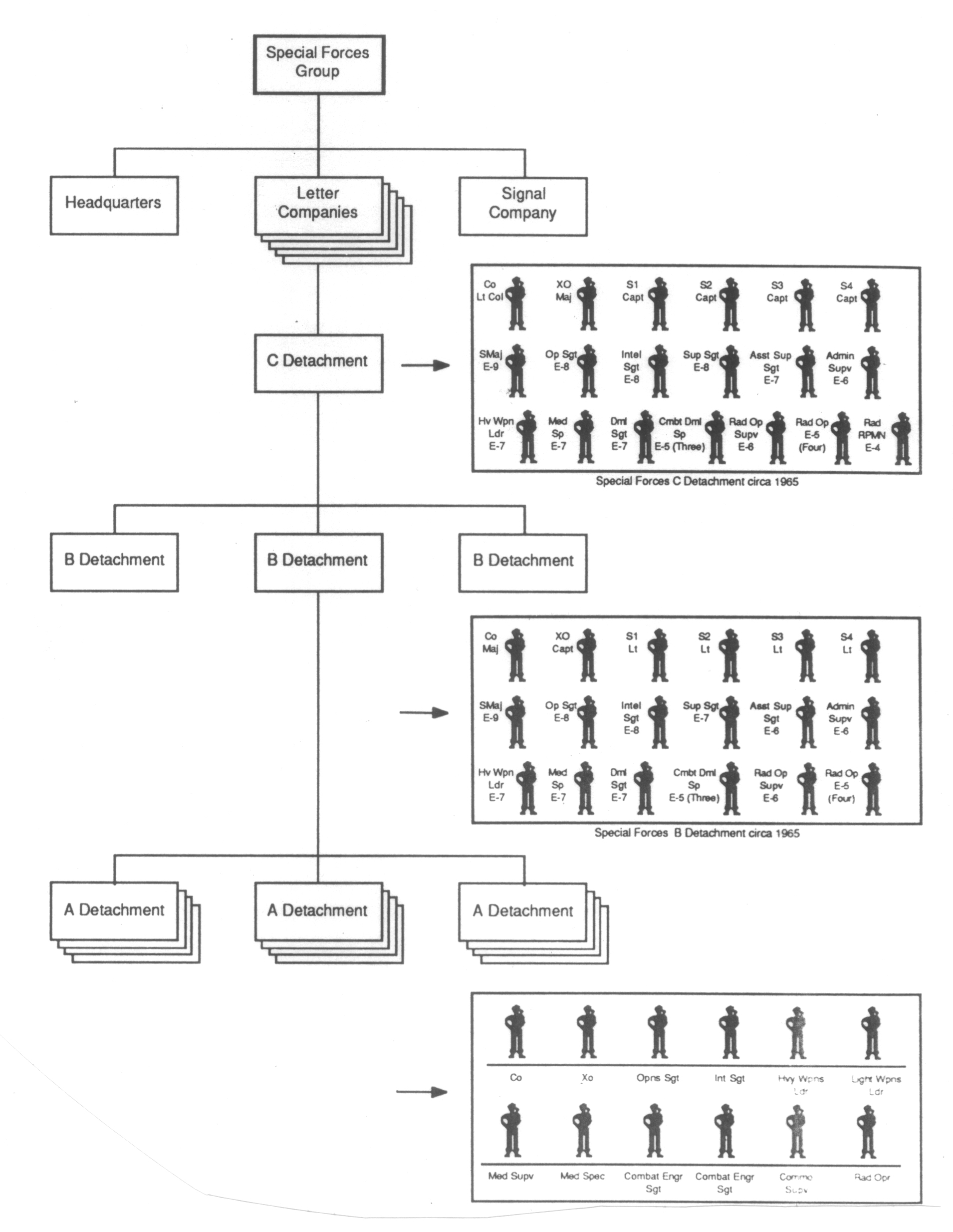 Next is the structure for an A team as it existed in the 60s. The current structure of Special Forces is totally different from that period, as is its mission. The core mission, at least prior to the Vietnam conflict, was to have a unit with the capability to infiltrate behind enemy lines, recruit local people, train them into a fighting guerrilla force, and then to conduct military operations as required. To accomplish this require men skilled in the arts or war as well as teaching and training. Since they were to operate behind enemy lines they also needed to be independent thinkers, resourceful and self-motivated. This combination of skills was not required in any other unit in the military then or now and that is what made “Green Berets” unique.