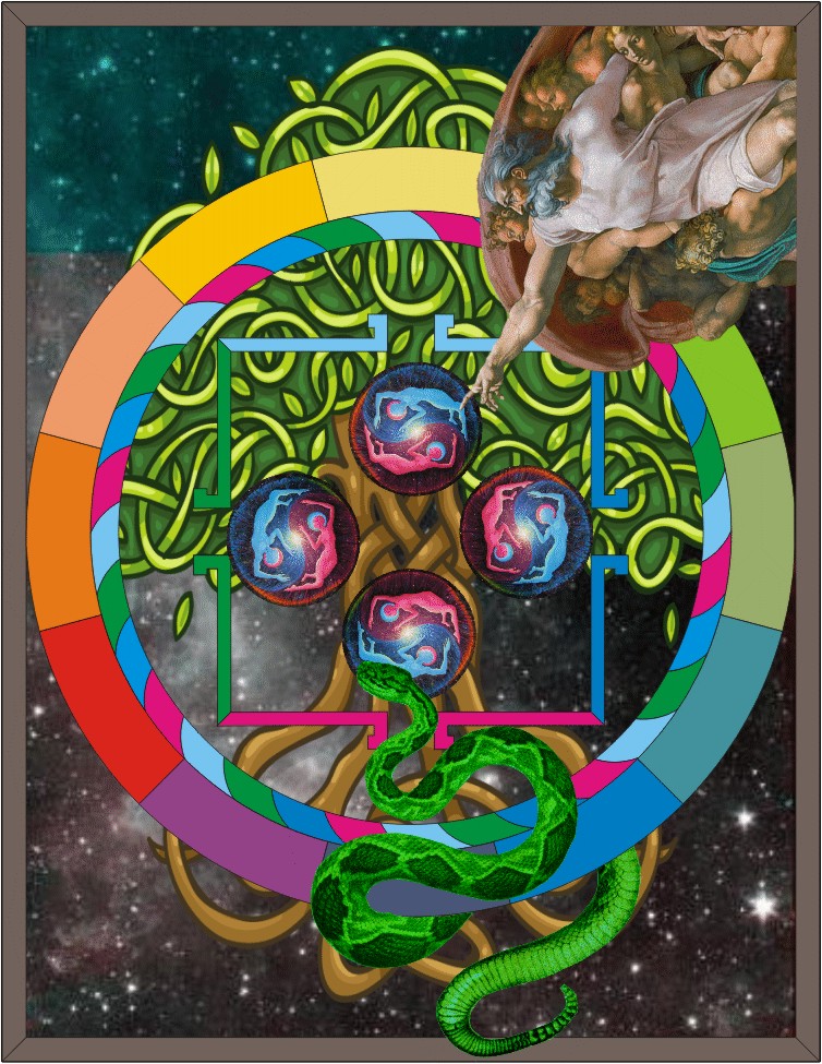 This paper will be focusing on the Classical Greek views and how the Classical Greek view transitioned into Contemporary Philosophy and the Progressive Atheist belief structure starting just before the change from the 19th century to the 20th century. This was, of course, when Marxism took hold of (pseudo) intellectual thought. Those two, Contemporary and Progressive Atheist, belief systems currently make up most of what we call Western Civilization. The first tree Chapters are very important and all else is derived from what is presented there. If you can not at minimum agree that my proposition is possible then there would be little advantage to read the rest of the book. Western Civilization is in a period that will either end it or transform it into something unknown; these these kinds transition rarely go without major conflicts. According to reliably sources I know we will be though this period by mid century. Below is an motif image I created representing the universe we live in, its explained in detail in chapter two of the book.