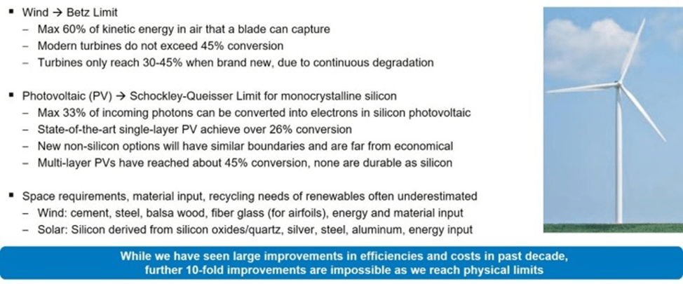 Below figure summarizes energy conversion efficiencies for wind and solar and the laws they follow. Conversion efficiency measures the ratio between the useful output of an energy conversion machine and the input, in energy terms, thus after accounting for capacity factor.