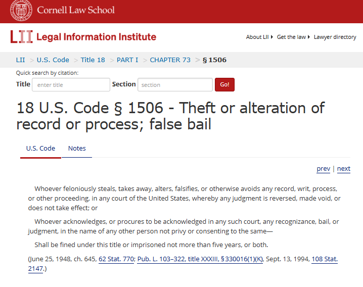 The federal statute that most directly makes it a felony to alter court documents is 18 U.S.C. § 1506 – Theft or alteration of records or process
