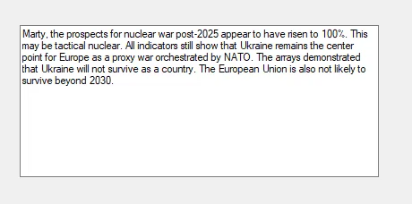 When I ask Socrates what the prospects of nuclear war are, it still comes up with 100%. It still sees the end of Ukraine, and it still projects the collapse of the European Union post-2030. These are not my personal opinions.