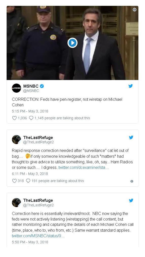 It was not unexpected to see NBC shift their earlier reporting on the surveillance of Trump lawyer Michael Cohen and attempt to walk-back the most troubling of issues. In a correction to earlier reporting NBC changes the story from federal authorities (ie. Robert Mueller and the corrupt FBI group) “wiretapping” the phones and communication devices of Cohen, to federal authorities “monitoring” the phones and devices of Cohen.