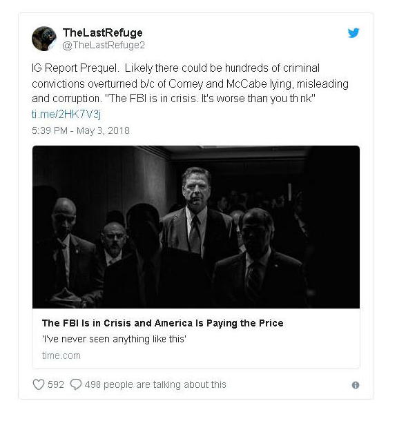 The 16-month Inspector General review of the DOJ/FBI investigation of the Hillary Clinton email is soon to be made public. The IG inquiry is specifically looking into whether the FBI investigation was corrupted by political influence in their determination of the Clinton outcome. The preliminary investigative outcomes speak for themselves.