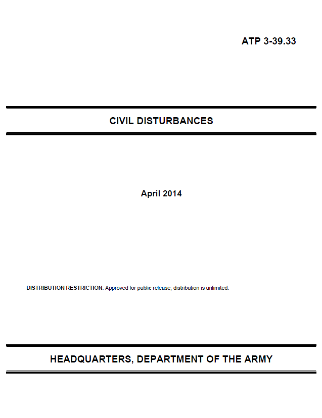 The new Army manual, known as ATP 3-39.33, provides discussion and techniques about civil disturbances and crowd control operations that occur in the continental United States (CONUS) and outside the continental United States (OCONUS).